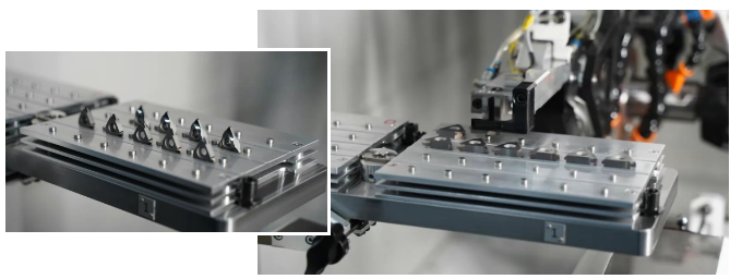 Both the robotic arm and the material tray can be customized according to the blade processing requirements, supporting fast switching between multiple varieties and small batches, and also suitable for large-scale continuous production. The positioning device ensures that the blade is calibrated before installation to prevent human error. While improving efficiency, it lays the foundation for achieving unmanned and automated continuous production.